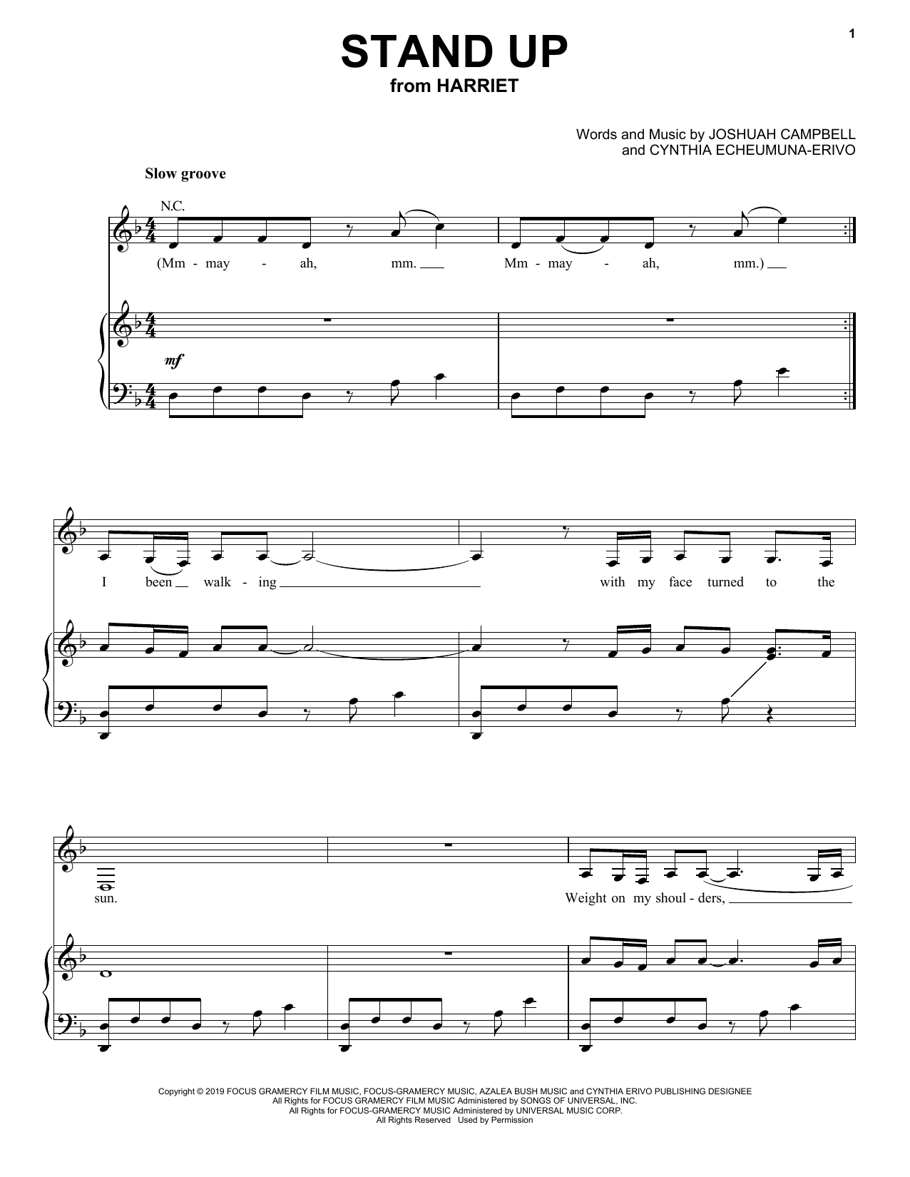 Download or print Cynthia Erivo Stand Up (from Harriet) sheet music, chords and digital score arranged for Piano, Vocal & Guitar Chords (Right-Hand Melody). This Film/TV score includes 10 page(s).