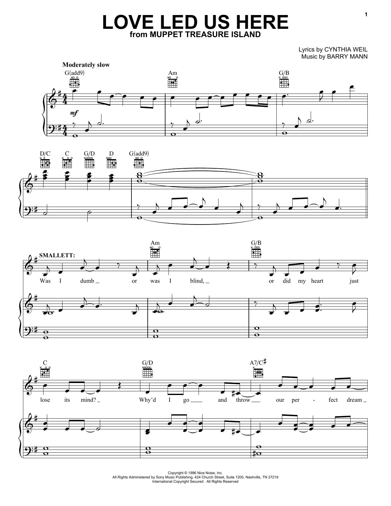 Download or print Cynthia Weil Love Led Us Here (from Muppet Treasure Island) sheet music, chords and digital score arranged for Piano, Vocal & Guitar Chords (Right-Hand Melody). This Disney score includes 5 page(s).