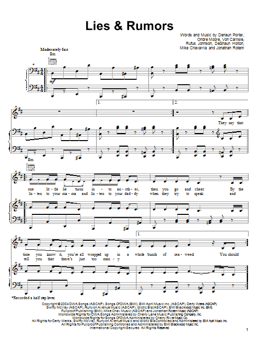 Download or print D12 Lies & Rumors sheet music, chords and digital score arranged for Piano, Vocal & Guitar Chords (Right-Hand Melody). This Film/TV score includes 12 page(s).