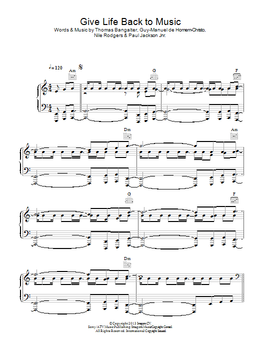 Download or print Daft Punk Give Life Back To Music sheet music, chords and digital score arranged for Piano, Vocal & Guitar Chords. This Pop score includes 7 page(s).