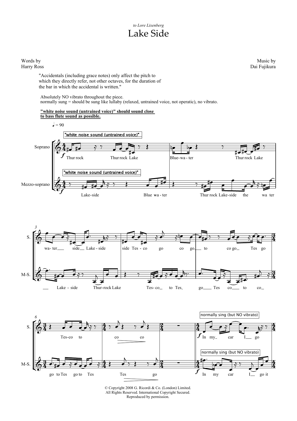 Download or print Dai Fujikura Lake Side (for mezzo-soprano) sheet music, chords and digital score arranged for Piano & Vocal. This Classical score includes 5 page(s).