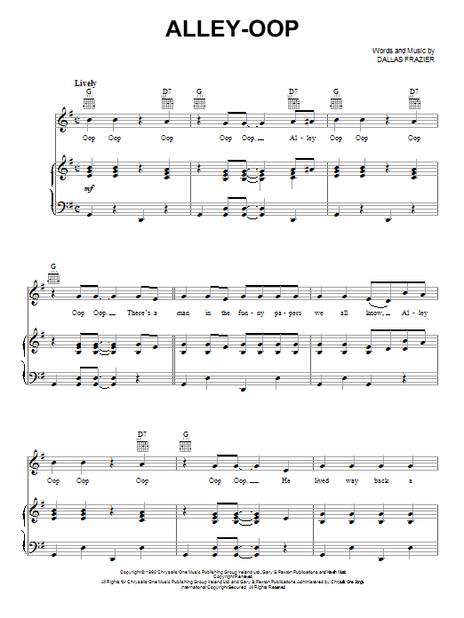 Download or print Dallas Frazier Alley-oop sheet music, chords and digital score arranged for Piano, Vocal & Guitar Chords (Right-Hand Melody). This Children score includes 4 page(s).