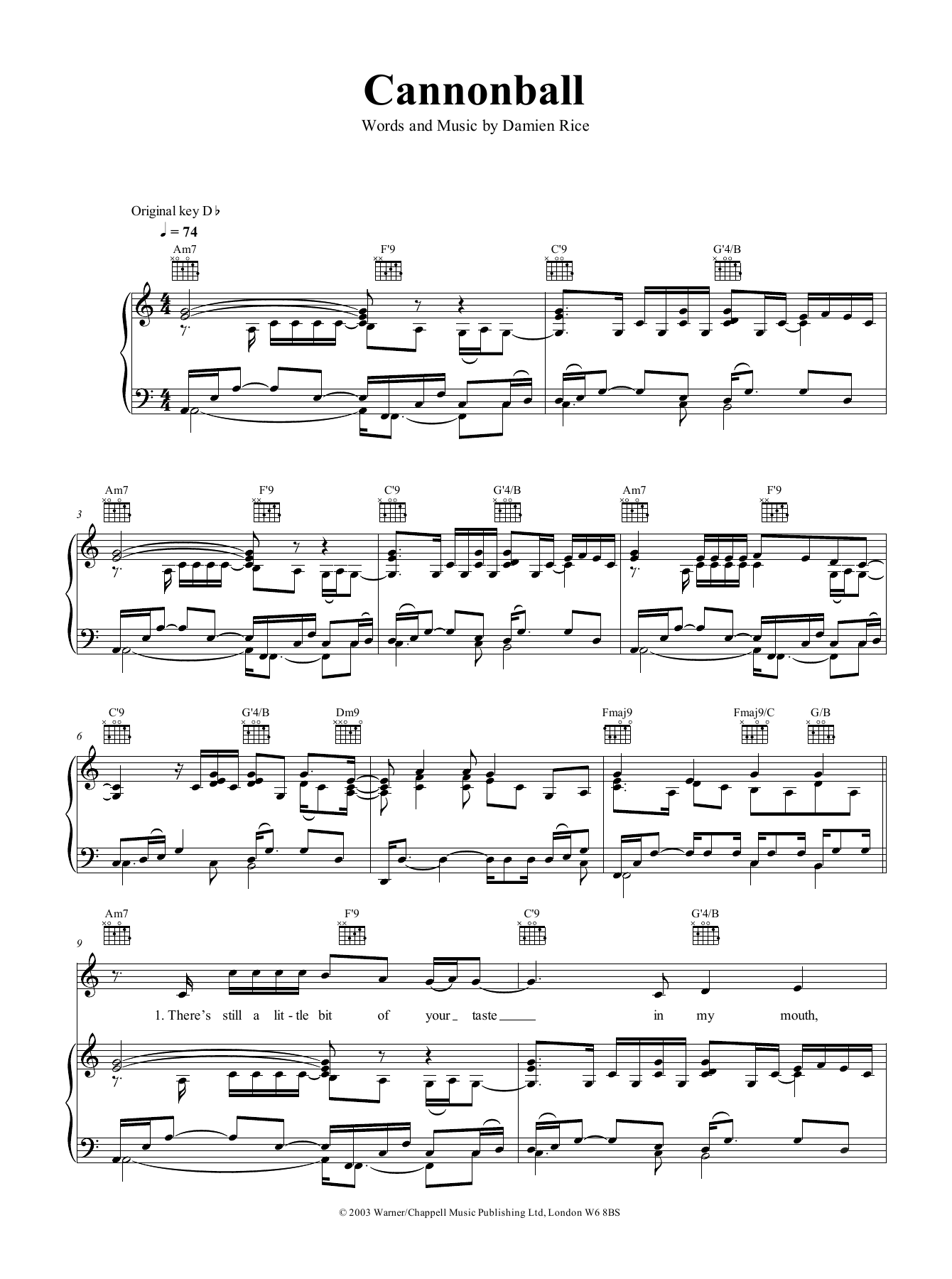 Download or print Damien Rice Cannonball sheet music, chords and digital score arranged for Piano, Vocal & Guitar Chords (Right-Hand Melody). This Pop score includes 7 page(s).