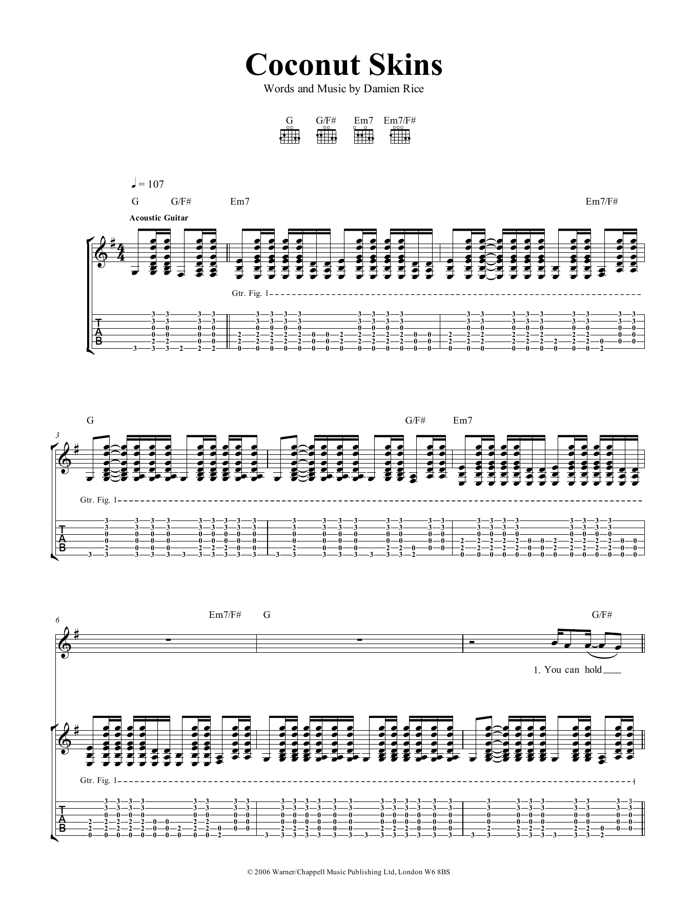 Download or print Damien Rice Coconut Skins sheet music, chords and digital score arranged for Guitar Tab. This Pop score includes 3 page(s).