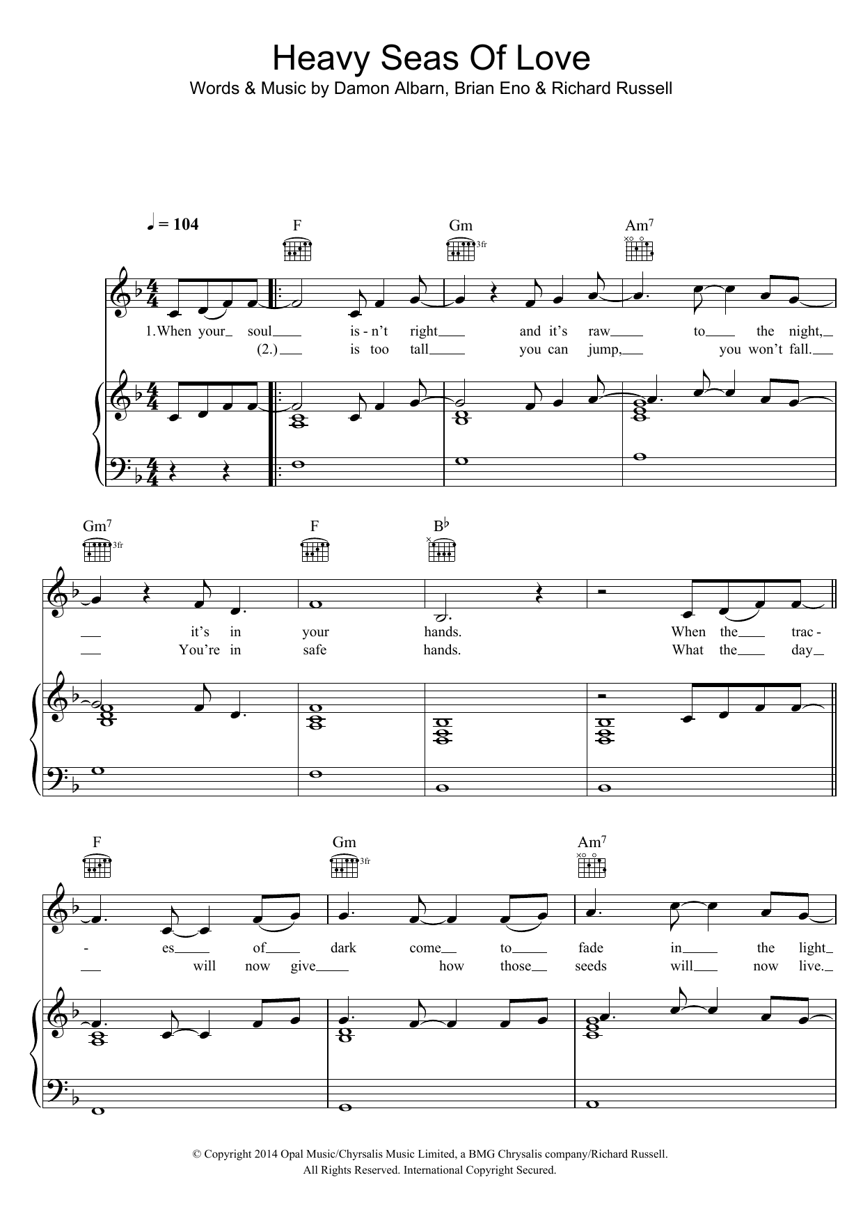 Download or print Damon Albarn Heavy Seas Of Love sheet music, chords and digital score arranged for Piano, Vocal & Guitar Chords. This Pop score includes 4 page(s).