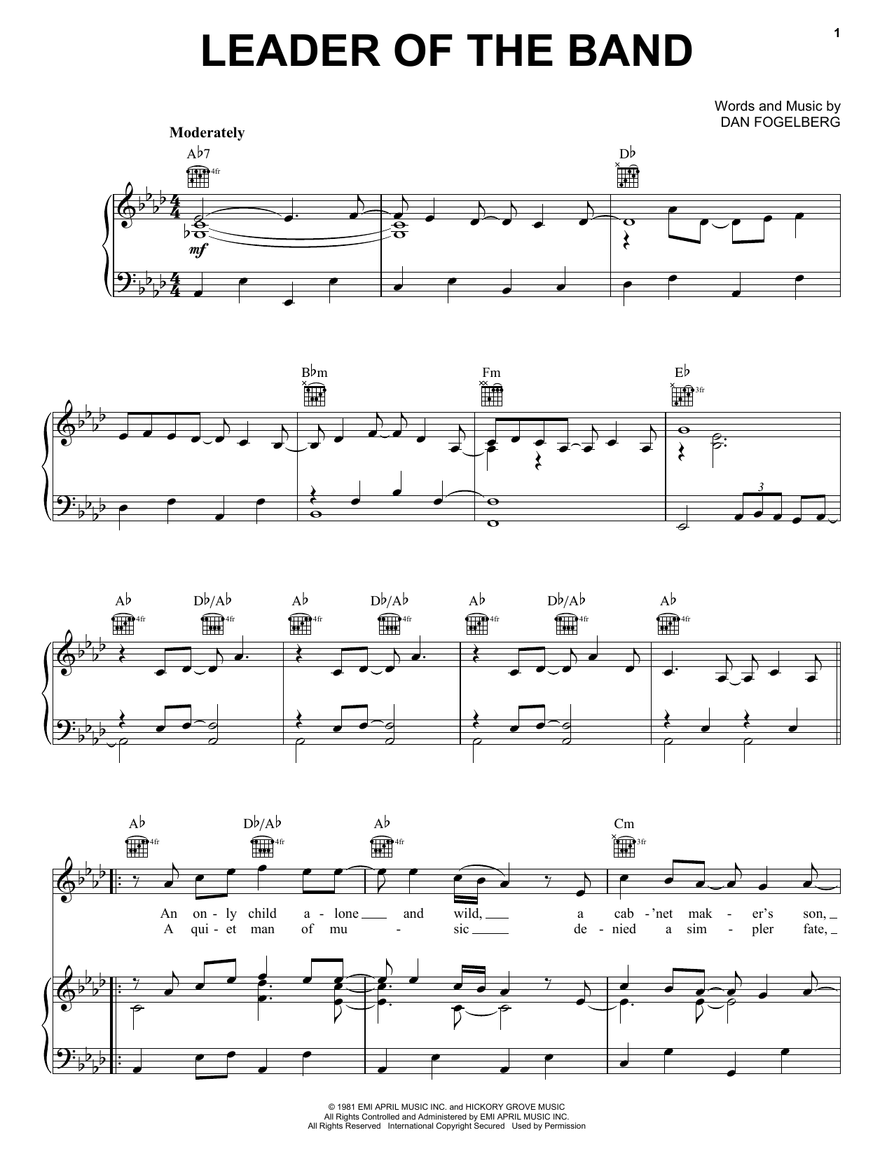 Download or print Dan Fogelberg Leader Of The Band sheet music, chords and digital score arranged for Piano, Vocal & Guitar Chords (Right-Hand Melody). This Folk score includes 8 page(s).