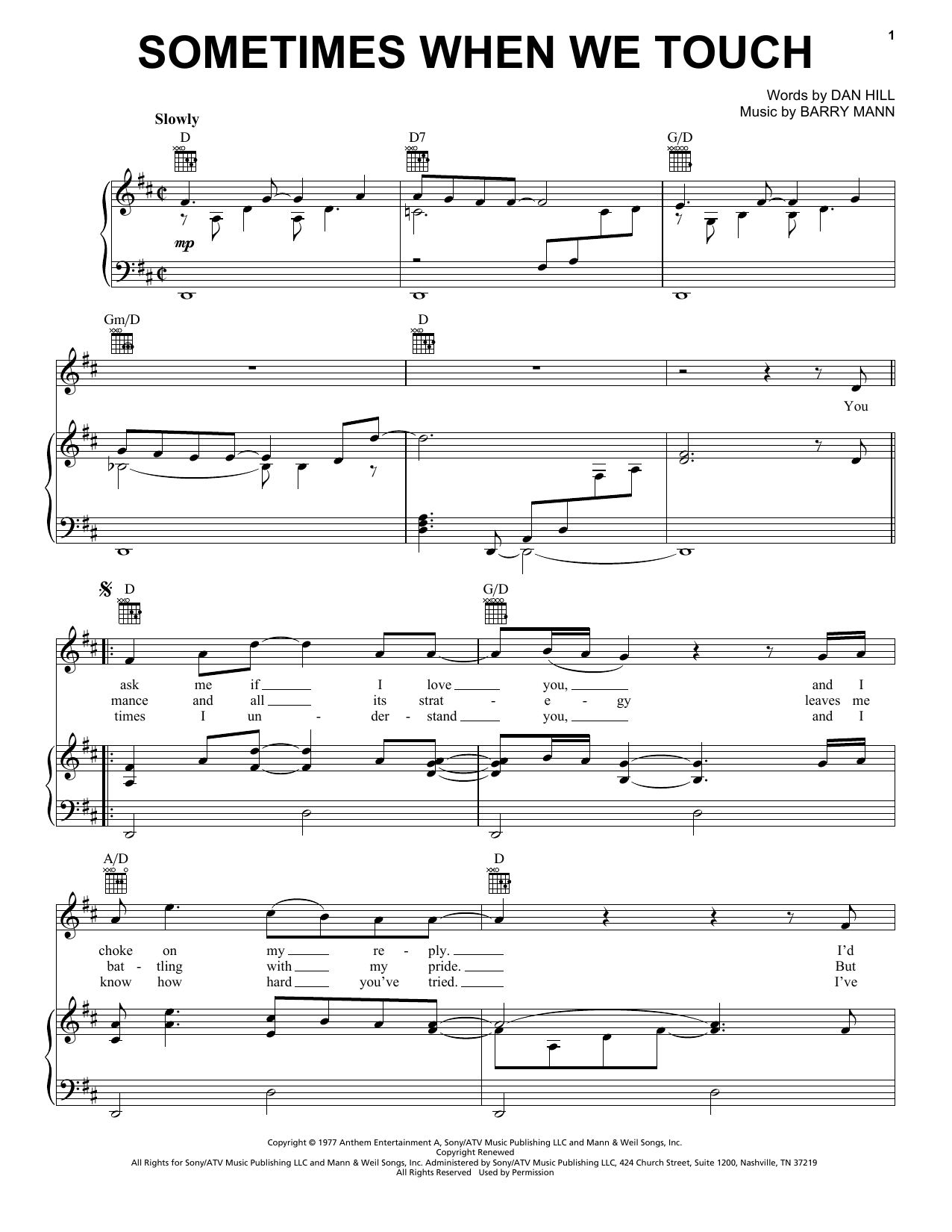 Download or print Dan Hill Sometimes When We Touch sheet music, chords and digital score arranged for Piano, Vocal & Guitar Chords (Right-Hand Melody). This Love score includes 5 page(s).