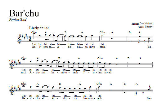 Download or print Dan Nichols Bar'chu sheet music, chords and digital score arranged for Lead Sheet / Fake Book. This Traditional score includes 1 page(s).