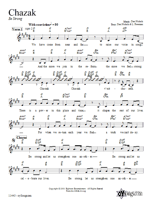 Download or print Dan Nichols Chazak sheet music, chords and digital score arranged for Lead Sheet / Fake Book. This Traditional score includes 2 page(s).