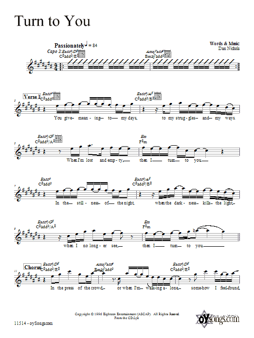 Download or print Dan Nichols Turn to You sheet music, chords and digital score arranged for Lead Sheet / Fake Book. This Traditional score includes 3 page(s).
