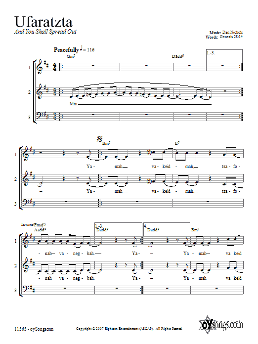 Download or print Dan Nichols Ufaratzta sheet music, chords and digital score arranged for 3-Part Mixed Choir. This Traditional score includes 2 page(s).