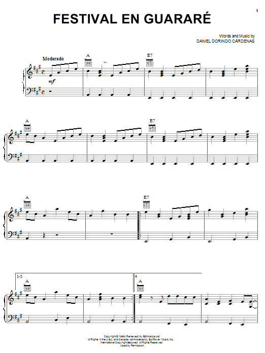 Download or print Daniel Dorindo Cardenas Festival En Guarare sheet music, chords and digital score arranged for Piano, Vocal & Guitar Chords (Right-Hand Melody). This Latin score includes 5 page(s).