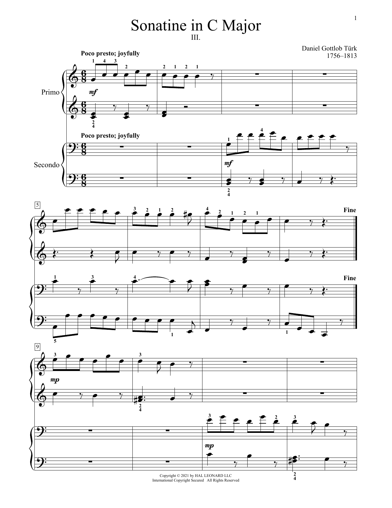 Download or print Daniel Gottlob Turk Sonatine In C Major sheet music, chords and digital score arranged for Piano Duet. This Classical score includes 3 page(s).
