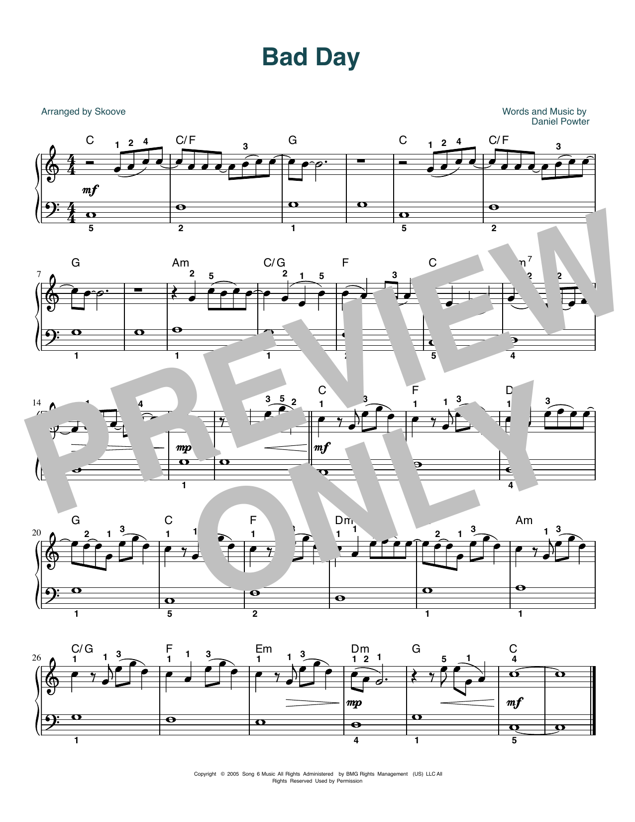 Download or print Daniel Powter Bad Day (arr. Skoove) sheet music, chords and digital score arranged for Beginner Piano (Abridged). This Pop score includes 1 page(s).