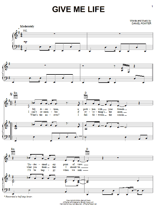 Download or print Daniel Powter Give Me Life sheet music, chords and digital score arranged for Piano, Vocal & Guitar Chords (Right-Hand Melody). This Pop score includes 7 page(s).