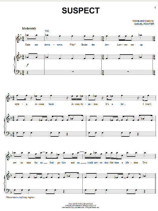 Download or print Daniel Powter Suspect sheet music, chords and digital score arranged for Piano, Vocal & Guitar Chords (Right-Hand Melody). This Pop score includes 8 page(s).