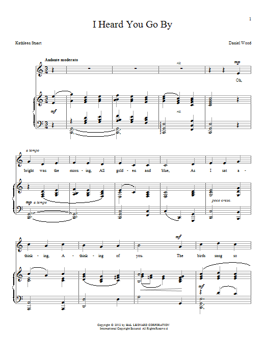 Download or print Daniel Wood I Heard You Go By sheet music, chords and digital score arranged for Piano & Vocal. This Folk score includes 3 page(s).