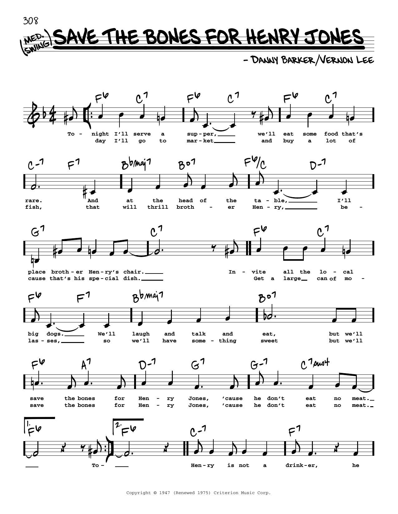 Download or print Danny Barker Save The Bones For Henry Jones (Low Voice) sheet music, chords and digital score arranged for Real Book – Melody, Lyrics & Chords. This Jazz score includes 2 page(s).