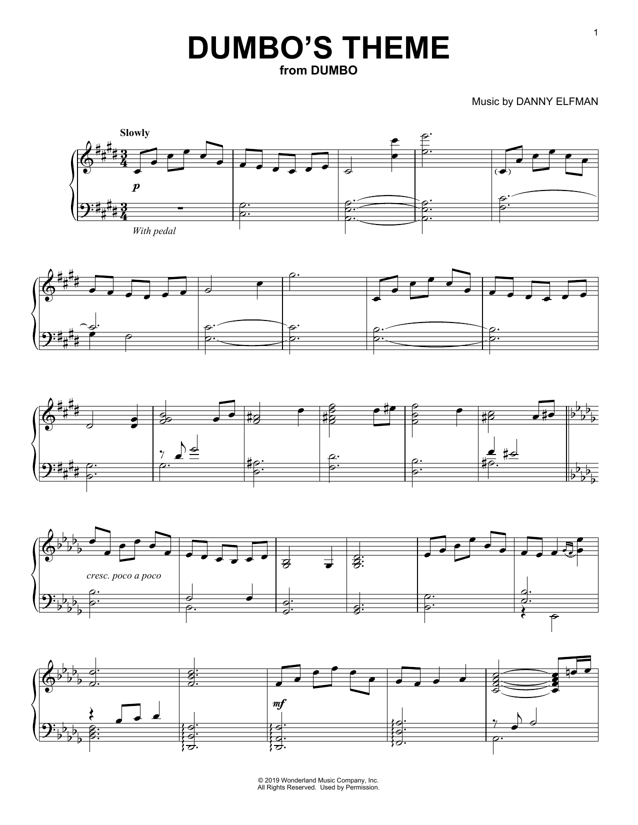 Download or print Danny Elfman Dumbo's Theme (from the Motion Picture Dumbo) sheet music, chords and digital score arranged for Piano Solo. This Children score includes 2 page(s).
