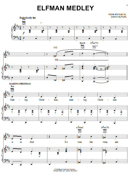 Download or print Danny Elfman Elfman Medley sheet music, chords and digital score arranged for Piano, Vocal & Guitar Chords (Right-Hand Melody). This Children score includes 8 page(s).