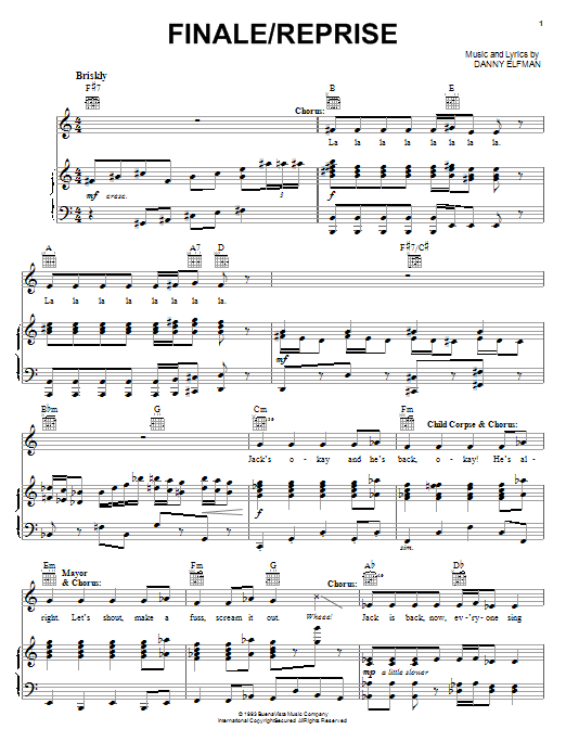 Download or print Danny Elfman Finale/Reprise (from The Nightmare Before Christmas) sheet music, chords and digital score arranged for Piano, Vocal & Guitar Chords (Right-Hand Melody). This Disney score includes 5 page(s).