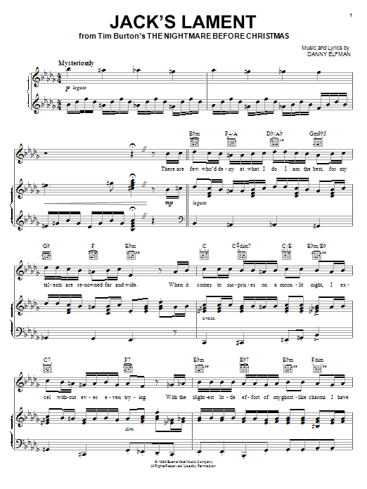 Download or print Danny Elfman Jack's Lament (from The Nightmare Before Christmas) sheet music, chords and digital score arranged for Piano Solo. This Children score includes 6 page(s).