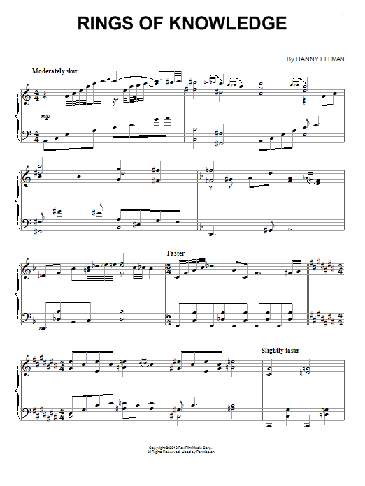 Download or print Danny Elfman Rings Of Knowledge sheet music, chords and digital score arranged for Piano Solo. This Children score includes 4 page(s).