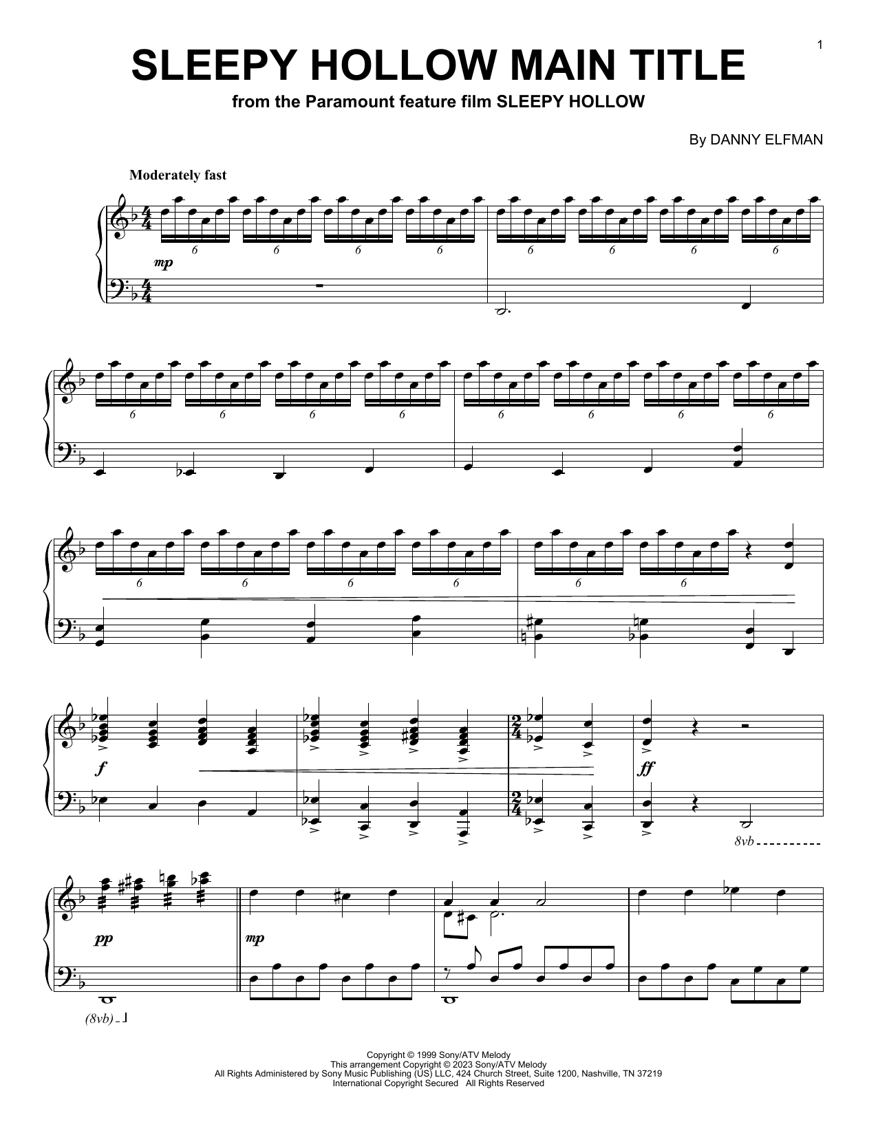 Download or print Danny Elfman Sleepy Hollow Main Title sheet music, chords and digital score arranged for Piano Solo. This Film/TV score includes 3 page(s).