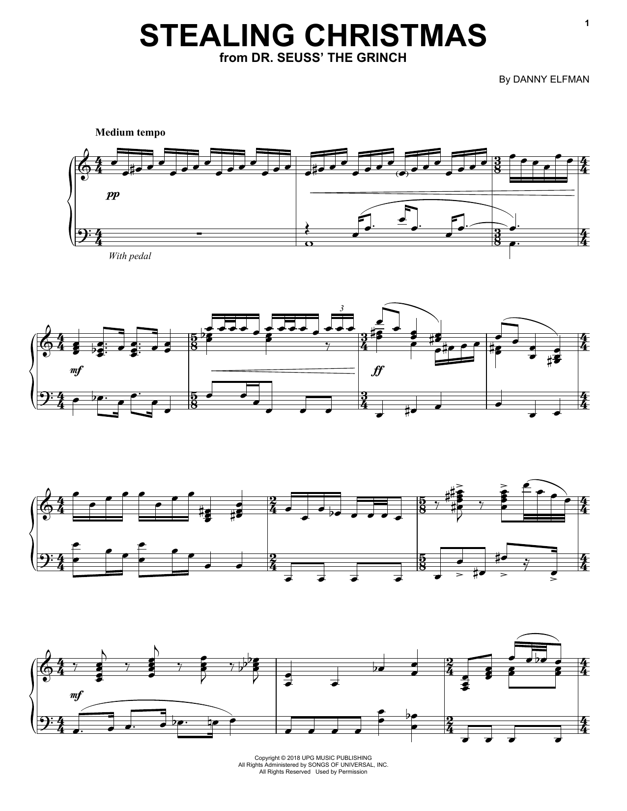 Download or print Danny Elfman Stealing Christmas (from The Grinch) sheet music, chords and digital score arranged for Piano Solo. This Children score includes 7 page(s).