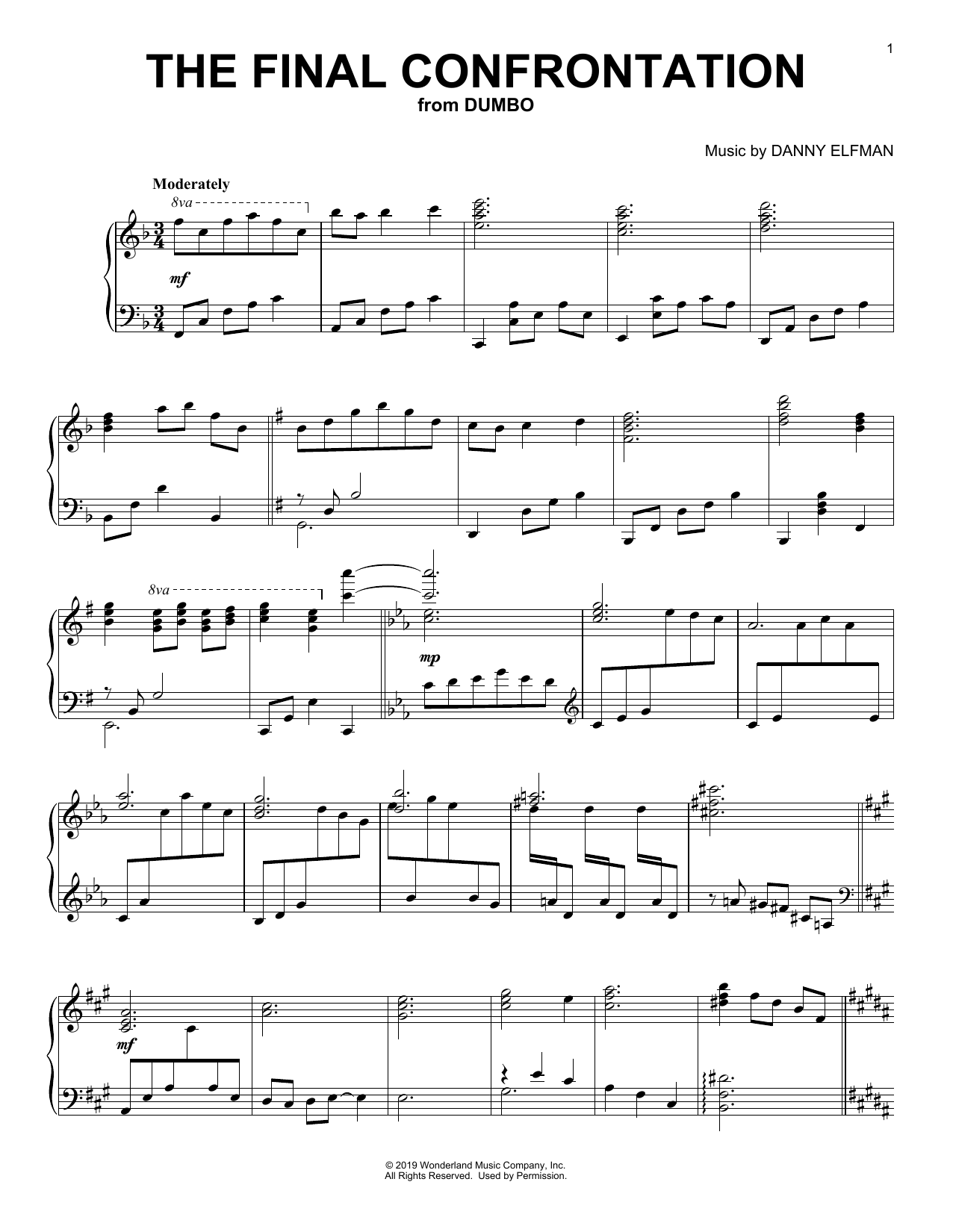 Download or print Danny Elfman The Final Confrontation (from the Motion Picture Dumbo) sheet music, chords and digital score arranged for Piano Solo. This Children score includes 3 page(s).