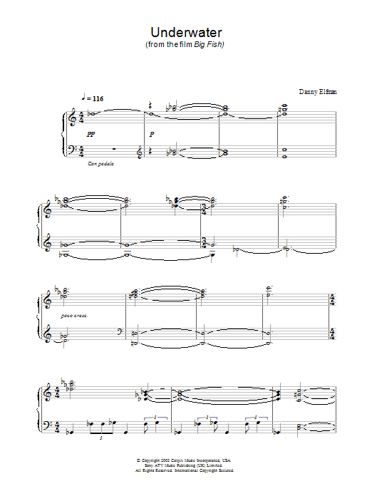 Download or print Big Fish Underwater sheet music, chords and digital score arranged for Piano Solo. This Film/TV score includes 3 page(s).