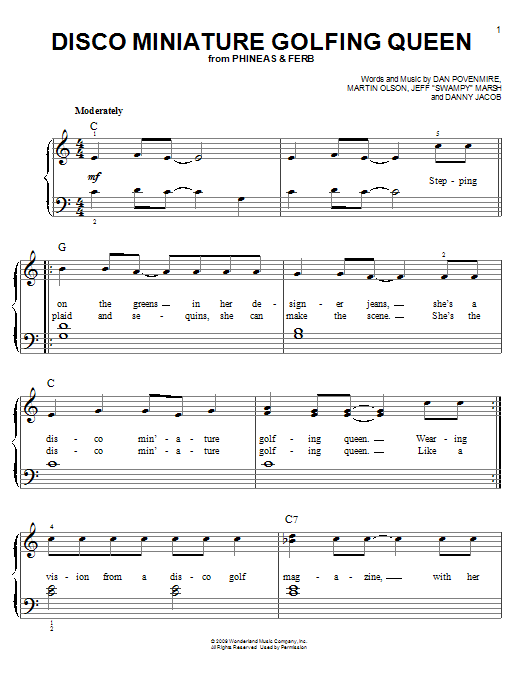 Download or print Danny Jacob Disco Miniature Golfing Queen sheet music, chords and digital score arranged for Easy Piano. This Children score includes 2 page(s).