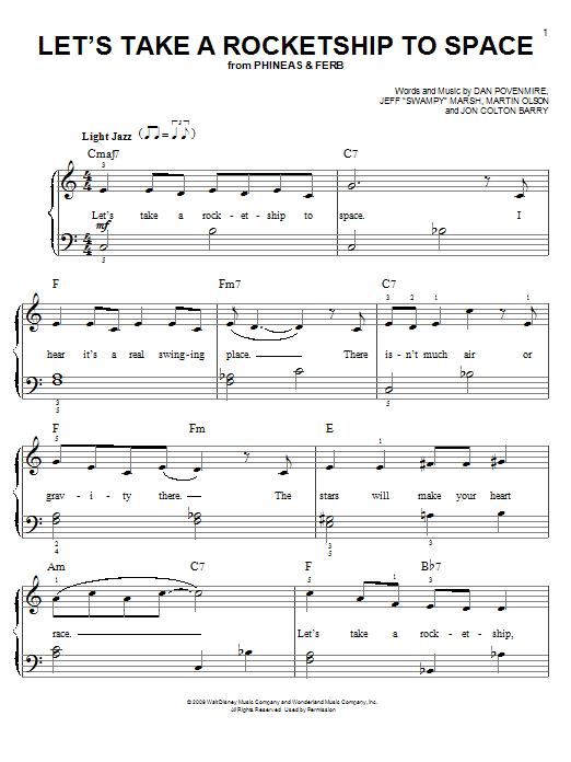 Download or print Danny Jacob Let's Take A Rocketship To Space sheet music, chords and digital score arranged for Easy Piano. This Children score includes 3 page(s).