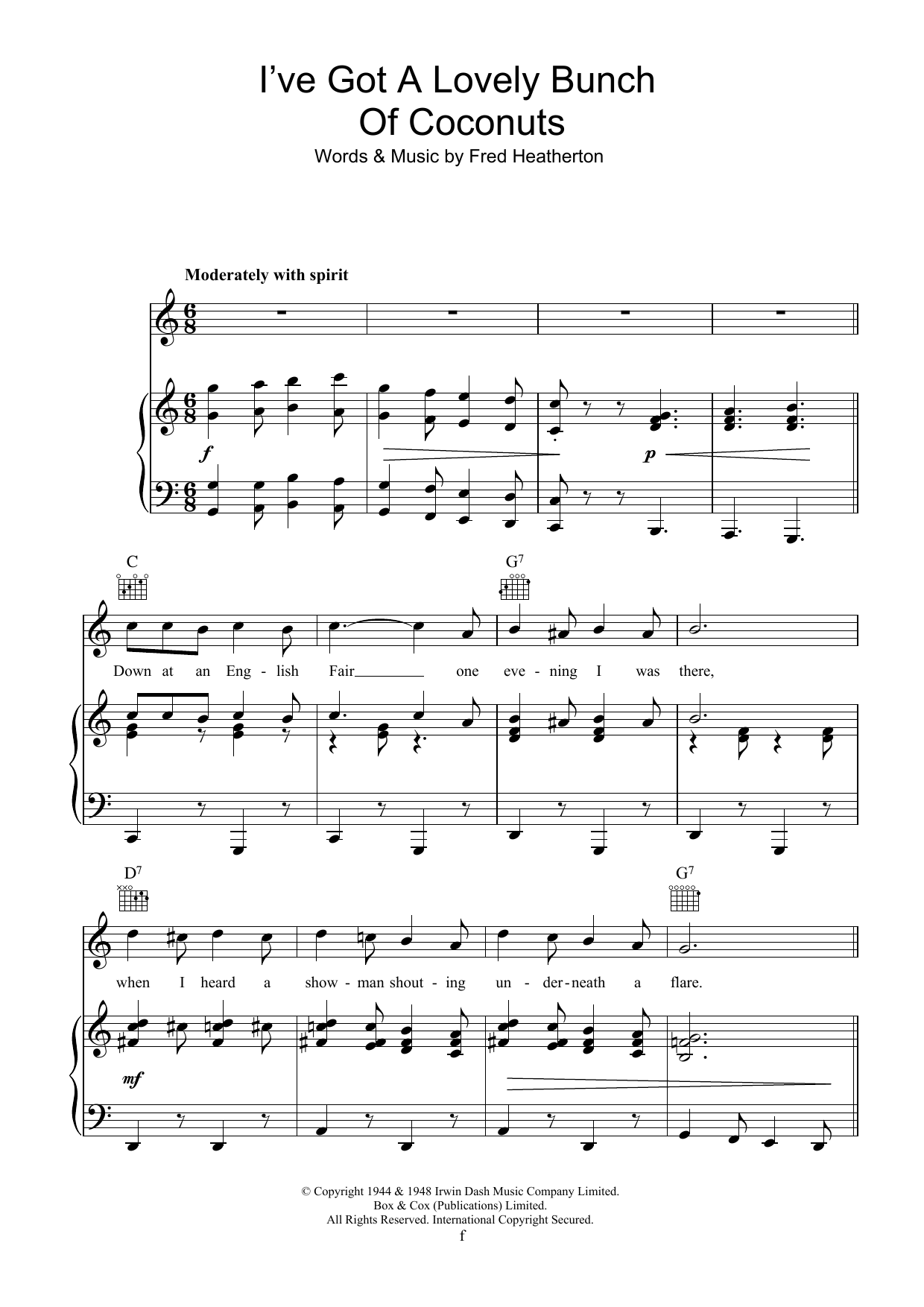 Download or print Danny Kaye I've Got A Lovely Bunch Of Coconuts sheet music, chords and digital score arranged for Piano, Vocal & Guitar Chords. This Standards score includes 4 page(s).