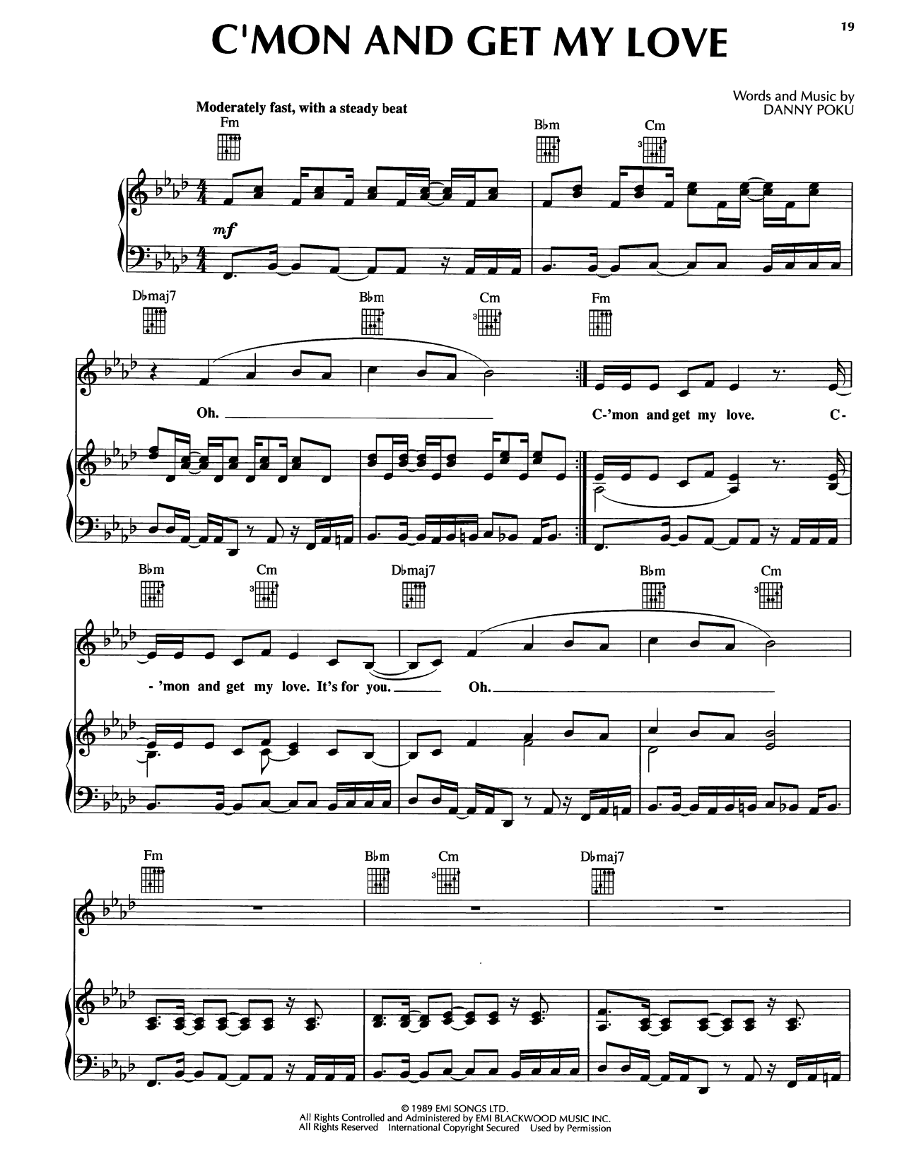 Download or print Danny Poku C'mon And Get My Love (feat. Cathy Dennis) sheet music, chords and digital score arranged for Piano, Vocal & Guitar Chords (Right-Hand Melody). This Pop score includes 7 page(s).