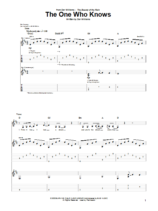 Download or print Dar Williams The One Who Knows sheet music, chords and digital score arranged for Guitar Tab. This Folk score includes 7 page(s).