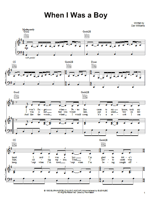 Download or print Dar Williams When I Was A Boy sheet music, chords and digital score arranged for Piano, Vocal & Guitar Chords (Right-Hand Melody). This Country score includes 6 page(s).