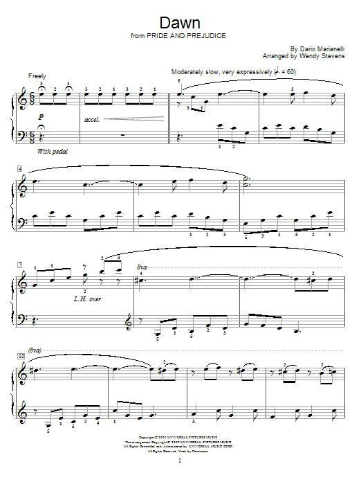 Download or print Dario Marianelli Dawn (from Pride And Prejudice) (arr. Wendy Stevens) sheet music, chords and digital score arranged for Educational Piano. This Film/TV score includes 6 page(s).