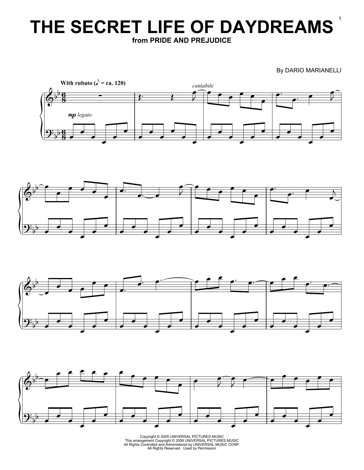 Download or print Dario Marianelli The Secret Life Of Daydreams (from Pride And Prejudice) sheet music, chords and digital score arranged for Piano Solo. This Film/TV score includes 2 page(s).