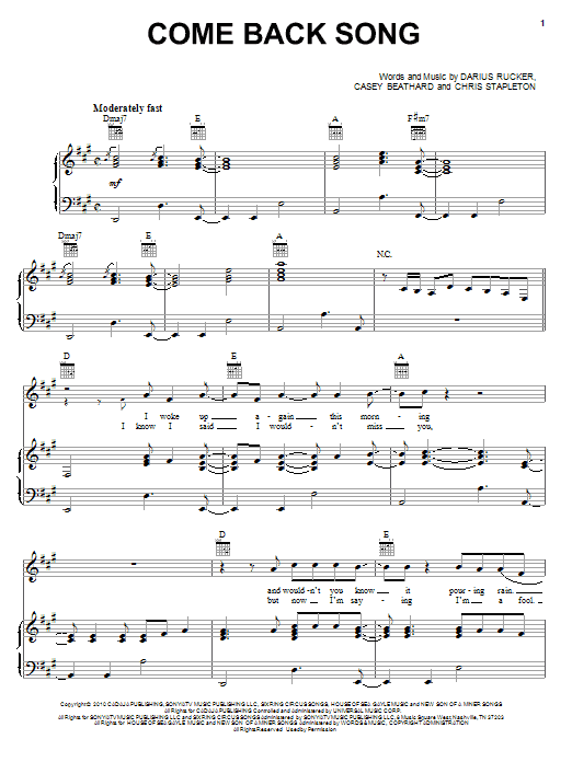 Download or print Darius Rucker Come Back Song sheet music, chords and digital score arranged for Piano, Vocal & Guitar Chords (Right-Hand Melody). This Pop score includes 8 page(s).