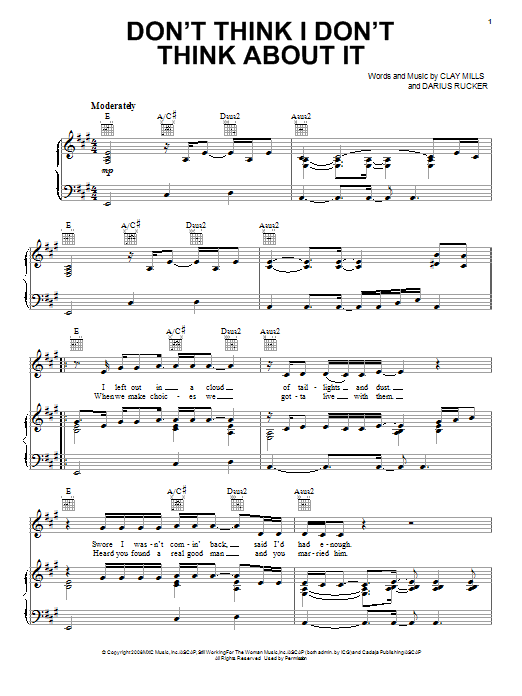 Download or print Darius Rucker Don't Think I Don't Think About It sheet music, chords and digital score arranged for Piano, Vocal & Guitar Chords (Right-Hand Melody). This Country score includes 5 page(s).