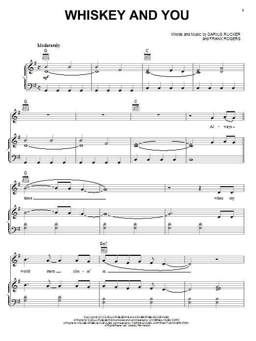 Download or print Darius Rucker Whiskey And You sheet music, chords and digital score arranged for Piano, Vocal & Guitar Chords (Right-Hand Melody). This Country score includes 8 page(s).