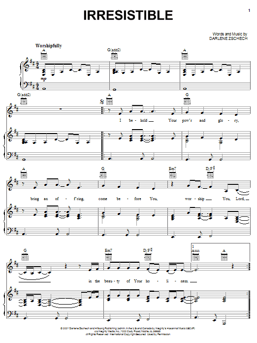 Download or print Darlene Zschech Irresistible sheet music, chords and digital score arranged for Piano, Vocal & Guitar Chords (Right-Hand Melody). This Christian score includes 4 page(s).