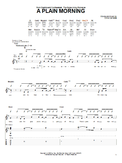 Download or print Dashboard Confessional A Plain Morning sheet music, chords and digital score arranged for Guitar Tab. This Pop score includes 5 page(s).