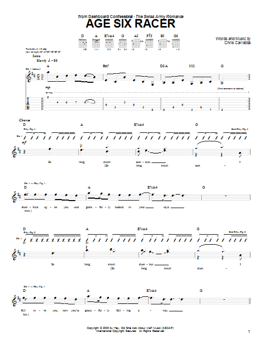 Download or print Dashboard Confessional Age Six Racer sheet music, chords and digital score arranged for Guitar Tab. This Pop score includes 3 page(s).