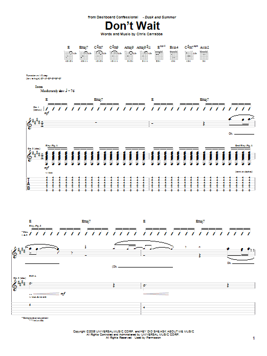 Download or print Dashboard Confessional Don't Wait sheet music, chords and digital score arranged for Guitar Tab. This Pop score includes 10 page(s).