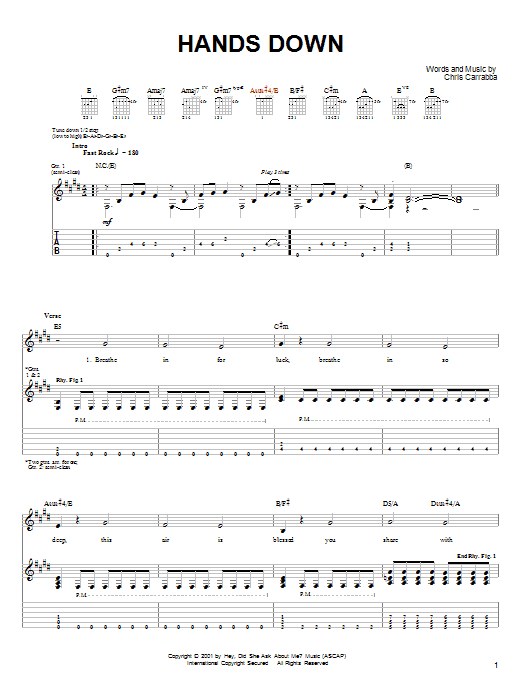 Download or print Dashboard Confessional Hands Down sheet music, chords and digital score arranged for Guitar Tab. This Pop score includes 10 page(s).
