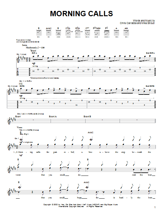 Download or print Dashboard Confessional Morning Calls sheet music, chords and digital score arranged for Guitar Tab. This Pop score includes 5 page(s).