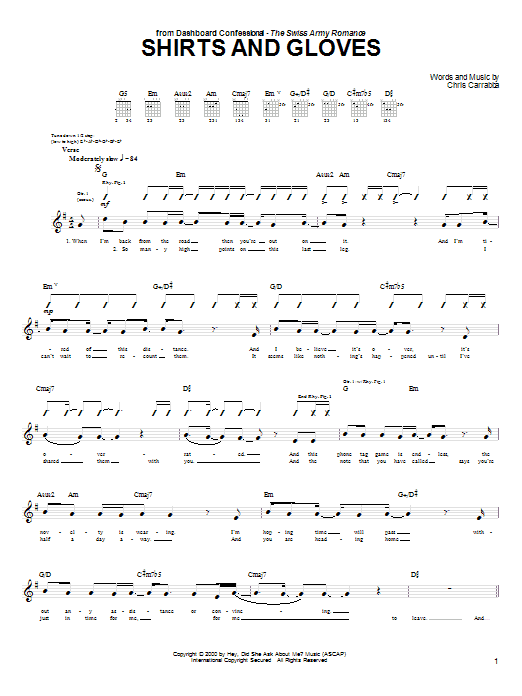 Download or print Dashboard Confessional Shirts And Gloves sheet music, chords and digital score arranged for Guitar Tab. This Pop score includes 3 page(s).