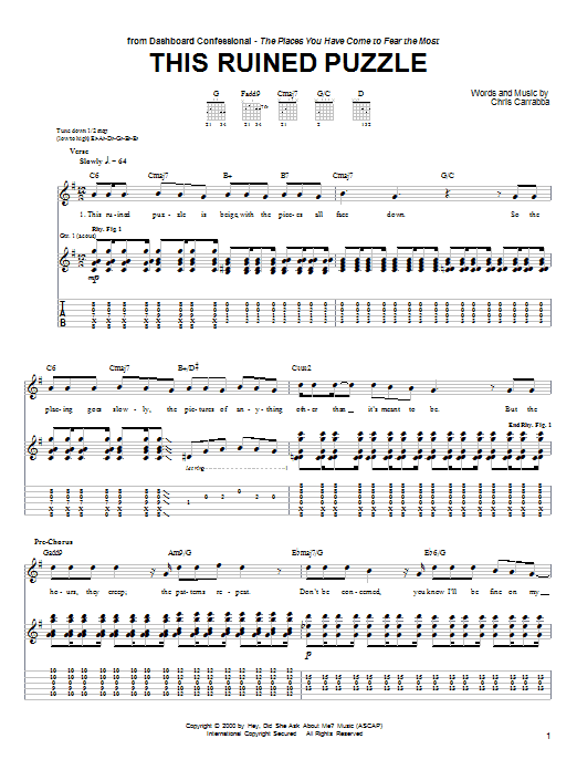 Download or print Dashboard Confessional This Ruined Puzzle sheet music, chords and digital score arranged for Guitar Tab. This Pop score includes 3 page(s).